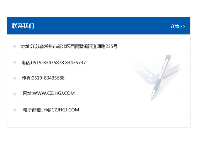 地址:常州市新北區友邦商務大廈1幢16、17層  電話:0519-85101652  傳真:0519-85112595  郵編:213022  網址:www_cz-jiayue_cn.tangcifu.com  郵箱:xiajifengaa@163.com